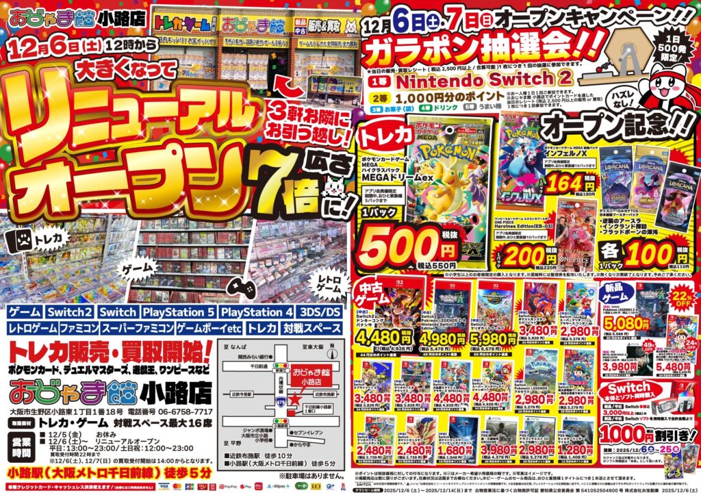 住所:〒544-0003 大阪府大阪市生野区小路東1丁目1番18号 電話番号:06-6758-7717 営業時間:平日 13:00~23:00 土・日・祝日 12:00~23:00 買取時間:平日 13:00~22:30 土・日・祝日 12:00~22:30 定休日:年中無休 駐車場:なし 取り扱い:ゲーム、トレカ トレカ対戦スペース:最大16席 |